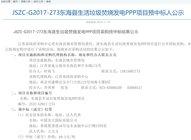 2018年11月19日,江蘇東??h1200噸/日的生活垃圾焚燒項目評標工作結(jié)束,光大國際成為預(yù)中標社會資本方,成交價格49.5元/噸。