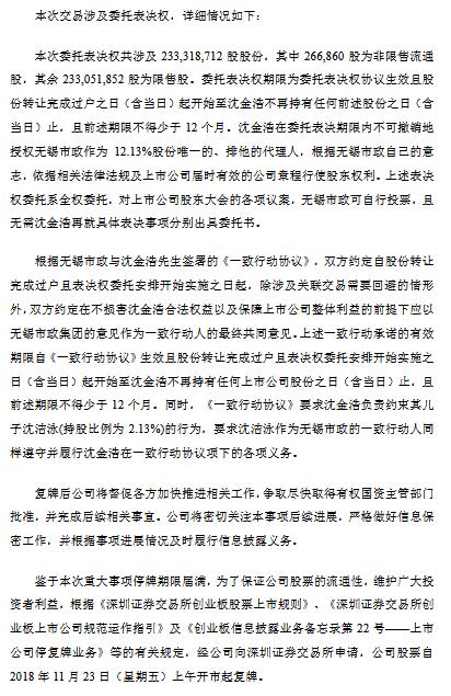 中金環(huán)境11月22日晚間公告,公司實(shí)際控制人沈金浩擬將1.28億股股份(占公司總股本的6.65%)轉(zhuǎn)讓給無錫市政,轉(zhuǎn)讓價(jià)格為4.42元/股,交易作價(jià)5.65億元。此外,沈金浩擬通過表決權(quán)委托方式將剩余股份中2.33億股股份對應(yīng)的表決權(quán)委托給無錫市政,占公司總股本的12.13%。交易完成后公司控股股東將變更為無錫市政,實(shí)際控制人將變更為無錫市國資委。公司股票將于11月23日復(fù)牌。