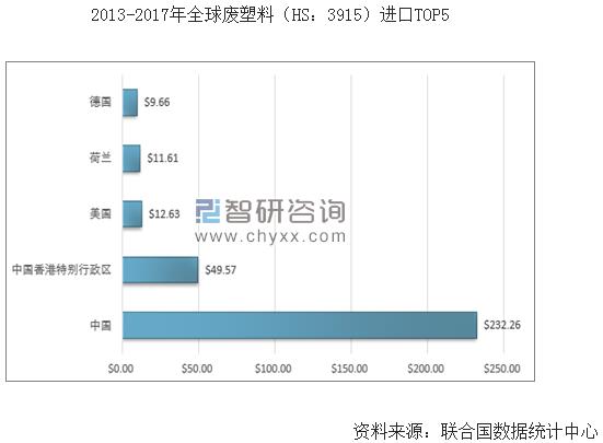 2017年我國再生塑料產(chǎn)量為1693萬噸,同步下降9.85%。從原材料市場供給來看,2013-2017年間,中國是全球最大的廢塑料(HS:3915)進(jìn)口國,進(jìn)口總額達(dá)232.26億美元,排在第二位的是中國香港特別行政區(qū),進(jìn)口總額為49.57億美元,美國、荷蘭、德國進(jìn)口總額依次為12.63億美元、11.61億美元、9.66億美元。