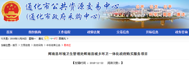 2018年11月22日,吉林省通化市輝南縣城鄉(xiāng)環(huán)衛(wèi)一體化政府購(gòu)買服務(wù)項(xiàng)目發(fā)布中標(biāo)公示,中國(guó)天楹股份有限公司成為中標(biāo)的社會(huì)資本方,中標(biāo)金額為3793.29萬(wàn)/年,服務(wù)期限3年,中標(biāo)總金額達(dá)1.14億。