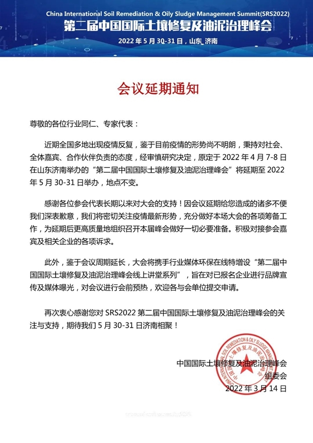 尊敬的各位行業(yè)同仁、專家代表: 鑒于近期疫情波及多個省市疫情形勢仍未明朗,秉持對社會、全體嘉賓、合作伙伴負責的態(tài)度,經(jīng)審慎研究決定,原定于 2022 年 5月 30-31日在山東濟南舉辦的“第二屆中國國際土壤修復及油泥治理峰會”將延期至 2022年8月(具體時間待定)舉辦,地...