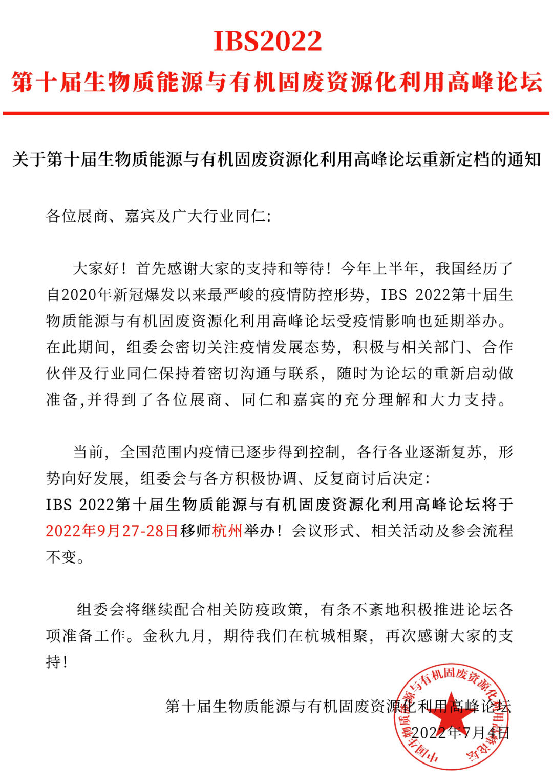 各有關(guān)單位、參會(huì)代表: 鑒于當(dāng)前疫情防控形勢(shì)仍較嚴(yán)峻復(fù)雜,為積極配合國(guó)家和地方防控要求,最大限度降低疫情傳播風(fēng)險(xiǎn),切實(shí)保障與會(huì)人員的健康安全,確保大會(huì)的質(zhì)量和效果,經(jīng)與各主辦單位協(xié)商決定:原定于2022年6月7日-9日舉辦的“2022鄉(xiāng)村振興與環(huán)境發(fā)展論壇、第二屆村鎮(zhèn)水環(huán)境治理產(chǎn)業(yè)與發(fā)展...