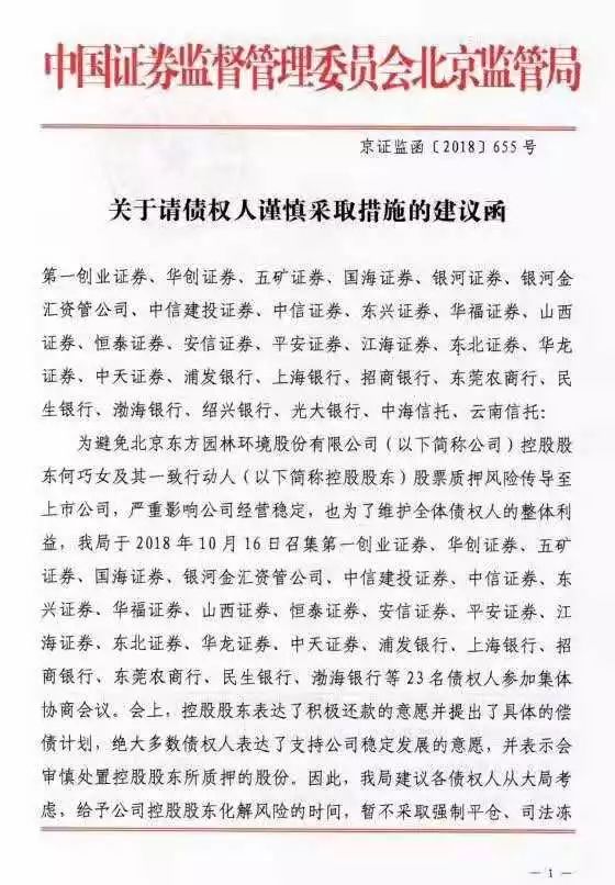 最近空降熱搜的企業(yè)中,有兩家公司成功吸引了天眼妹的目光。一家公司超級(jí)“大牌”,陷入股票質(zhì)押危機(jī)后,居然能震動(dòng)北京證監(jiān)局出手相救;另一家公司更慘,法人和第一大股東因積壓的債務(wù)危機(jī)爆發(fā)被列為失信被執(zhí)行人。巧合的是,這兩家企業(yè)都是曾經(jīng)以“股王”“不差錢”等形象行走A股的。▲北京證監(jiān)局給債權(quán)人的建議函東方園...