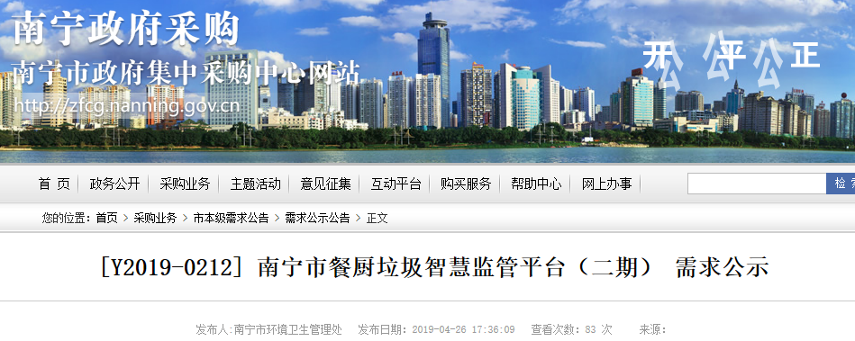 中國環(huán)聯(lián)網(wǎng)獲悉,4月26日,廣西南寧市餐廚垃圾智慧監(jiān)管平臺(二期)發(fā)布需求公示,項目預(yù)算總價572.57萬元。為保障政府采購各方當(dāng)事人的合法權(quán)益,確保政府采購公開、公平、公正。擬對南寧市餐廚垃圾智慧監(jiān)管平臺(二期) 進(jìn)行公開招標(biāo) ?,F(xiàn)將采購需求進(jìn)行公示,征詢各潛在供應(yīng)商的意見。1、項目預(yù)公示編號:Y...