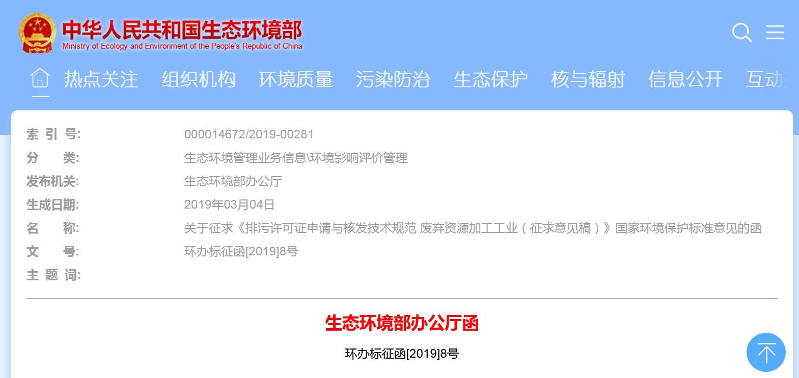 關(guān)于征求《排污許可證申請與核發(fā)技術(shù)規(guī)范 廢棄資源加工工業(yè)(征求意見稿)》國家環(huán)境保護標準意見的函生態(tài)環(huán)境部辦公廳函環(huán)辦標征函[2019]8號關(guān)于征求《排污許可證申請與核發(fā)技術(shù)規(guī)范 廢棄資源加工工業(yè)(征求意見稿)》國家環(huán)境保護標準意見的函各有關(guān)單位:為落實《國務院辦公廳關(guān)于印發(fā)控制污染物排放許可制實施...
