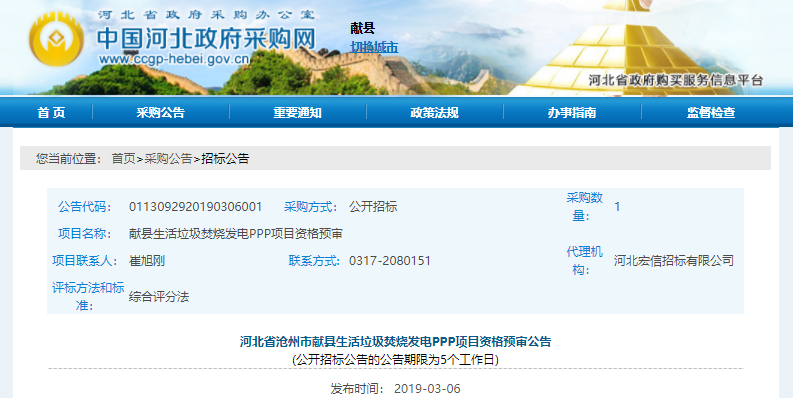 中國環(huán)聯(lián)網(wǎng)獲悉,3月6日,河北省滄州市獻(xiàn)縣生活垃圾焚燒發(fā)電PPP項目發(fā)布資格預(yù)審公告。本項目中主要建設(shè)內(nèi)容為:2×300t/d機(jī)械爐排爐+1×12MW凝汽式汽輪發(fā)電機(jī)組;配套建設(shè)垃圾接受與儲存系統(tǒng)、垃圾焚燒系統(tǒng)、余熱發(fā)電系統(tǒng)、煙氣凈化處理系統(tǒng)、灰渣處理系統(tǒng)、水處理系統(tǒng)等。本項目采用PPP運(yùn)作方式中的...