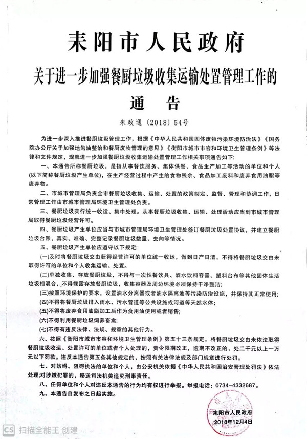 為進(jìn)一步深入推進(jìn)餐廚垃圾管理工作,根據(jù)《中華人民共和國固體廢物污染環(huán)境防治法》《國務(wù)院辦公廳關(guān)于加強(qiáng)地溝油整治和餐廚廢物管理的意見》《衡陽市城市市容和環(huán)境衛(wèi)生管理?xiàng)l例》等法律和文件規(guī)定,現(xiàn)就進(jìn)一步加強(qiáng)餐廚垃圾收集運(yùn)輸處置管理工作相關(guān)事項(xiàng)通告如下:耒陽市人民政府關(guān)于進(jìn)一步加強(qiáng)餐廚垃圾收集運(yùn)輸處置管理工...