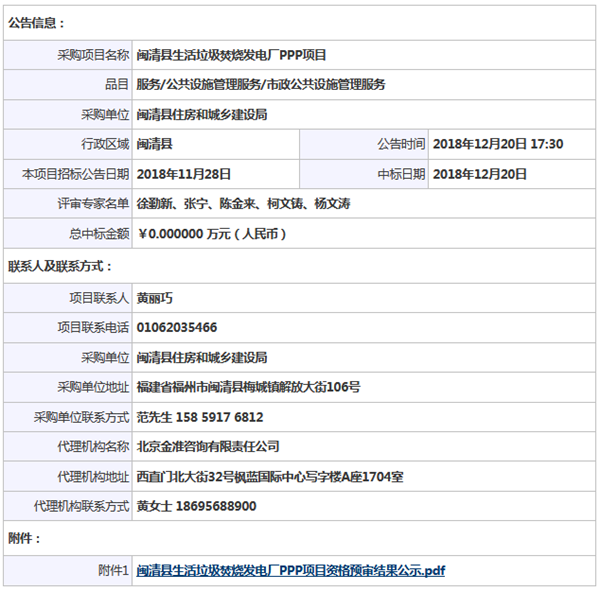 北京金準(zhǔn)咨詢有限責(zé)任公司受閩清縣住房和城鄉(xiāng)建設(shè)局的委托,就“閩清縣生活垃圾焚燒發(fā)電廠PPP項(xiàng)目”項(xiàng)目(項(xiàng)目編號(hào):JZXM-2018002)組織采購,評(píng)標(biāo)工作已經(jīng)結(jié)束,中標(biāo)結(jié)果如下:延伸閱讀:福建閩清縣生活垃圾焚燒發(fā)電廠PPP項(xiàng)目資格預(yù)審公告(第三次)閩清縣生活垃圾焚燒發(fā)電廠PPP項(xiàng)目資格預(yù)審(第二次...