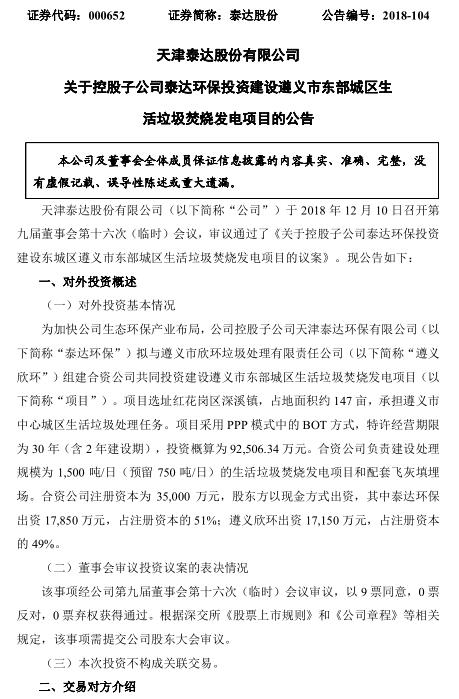 日前,泰達(dá)環(huán)保發(fā)布公告,公司控股子公司天津泰達(dá)環(huán)保有限公司(以下簡(jiǎn)稱(chēng)“泰達(dá)環(huán)保”)擬與遵義市欣環(huán)垃圾處理有限責(zé)任公司(以下簡(jiǎn)稱(chēng)“遵義欣環(huán)”)組建合資公司共同投資建設(shè)遵義市東部城區(qū)生活垃圾焚燒發(fā)電項(xiàng)目(以下簡(jiǎn)稱(chēng)“項(xiàng)目”)。項(xiàng)目選址紅花崗區(qū)深溪鎮(zhèn),占地面積約 147 畝,承擔(dān)遵義市中心城區(qū)生活垃圾處理任...
