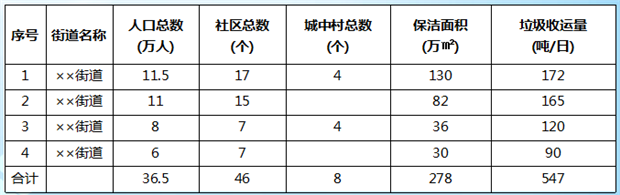 基本概述××區(qū)4個街道轄區(qū)保潔總面積278萬m2,垃圾收運量約547噸/日?!痢羺^(qū)4個街道基本概況一覽表當前運營狀況對標“創(chuàng)建全國文明城市”標準,當前××區(qū)4個街道轄區(qū)市容容貌標準不達標,具體表現(xiàn)為環(huán)衛(wèi)公司不專業(yè)、不“環(huán)衛(wèi)”亂象。如一些社區(qū)、城中村清掃保潔每日清掃一次,沒有安排保潔;城鄉(xiāng)結(jié)合部、三邊...