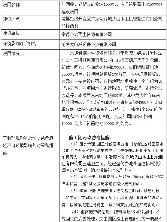 日前,湖南澧縣對年回收、倉儲廢礦物油10000t、廢舊鉛酸蓄電池50000t建設(shè)項目環(huán)境影響報告表進行擬審批公示,詳情如下:年回收、倉儲廢礦物油10000t、廢舊鉛酸蓄電池50000t建設(shè)項目環(huán)境影響報告表擬審批公示經(jīng)審議,我局擬于近日內(nèi)批準《年回收、倉儲廢礦物油10000t、廢舊鉛酸蓄電池5000...