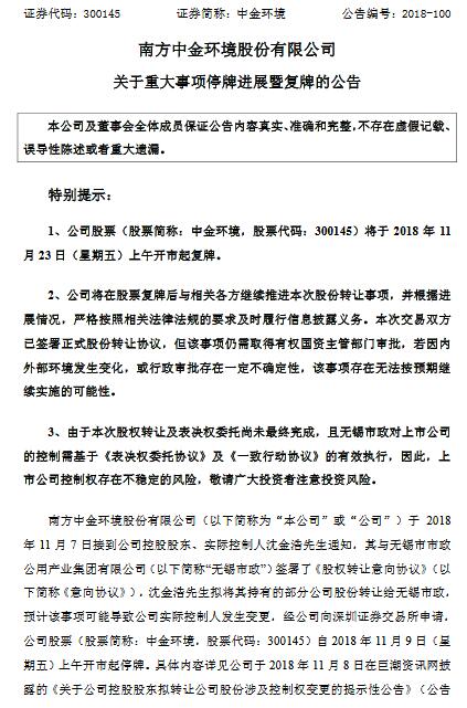 中金環(huán)境11月22日晚間公告,公司實際控制人沈金浩擬將1.28億股股份(占公司總股本的6.65%)轉(zhuǎn)讓給無錫市政,轉(zhuǎn)讓價格為4.42元/股,交易作價5.65億元。此外,沈金浩擬通過表決權(quán)委托方式將剩余股份中2.33億股股份對應的表決權(quán)委托給無錫市政,占公司總股本的12.13%。交易完成后公司控股股東...