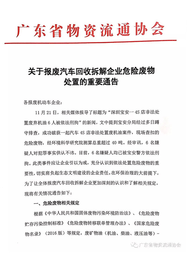 近日,廣東省物質(zhì)流通協(xié)會發(fā)布了《關(guān)于報廢汽車回收拆解企業(yè)危險廢物處置的重要通告》。具體內(nèi)容如下:原標題:關(guān)于報廢汽車回收拆解企業(yè)危險廢物處置的重要通告