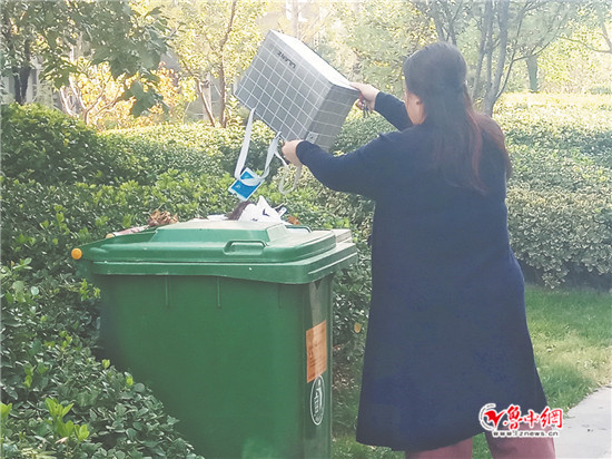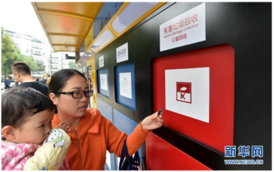 11月5日,竹西社區(qū)居民體驗操作智能垃圾分類回收箱。當日,江蘇省揚州市垃圾分類市民卡積分兌換平臺在邗江區(qū)竹西社區(qū)正式上線運行,該“互聯(lián)網(wǎng)+垃圾分類”數(shù)據(jù)平臺將垃圾分類積分與市民卡綁定,居民刷市民卡再分類投放垃圾即可獲得積分,積分可以在“再生資源兌換超市”中兌換生活用品。 新華社發(fā)(莊文斌 攝)11月...