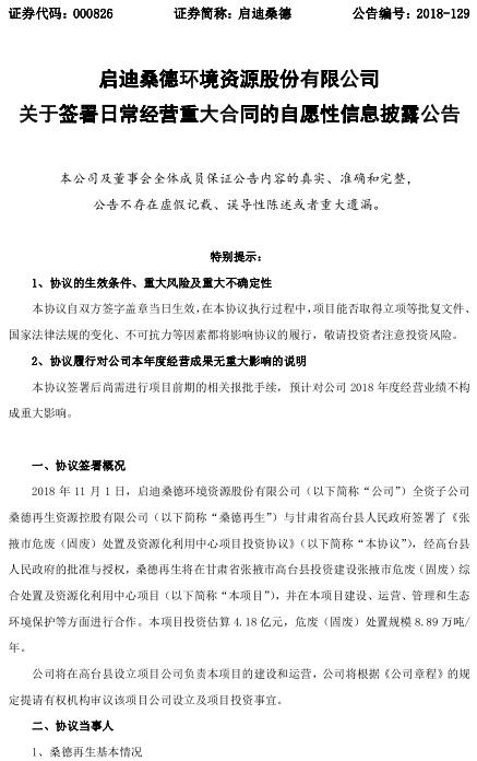 啟迪桑德日前公告,公司全資子公司桑德再生與甘肅省高臺(tái)縣人民政府簽署協(xié)議,桑德再生將在甘肅省張掖市高臺(tái)縣投資建設(shè)張掖市危廢(固廢)綜合處置及資源化利用中心項(xiàng)目,并在項(xiàng)目建設(shè)、運(yùn)營(yíng)、管理和生態(tài)環(huán)境保護(hù)等方面進(jìn)行合作。該項(xiàng)目投資估算4.18億元,危廢(固廢)處置規(guī)模8.89萬(wàn)噸/年。公告如下:延伸閱讀:青...
