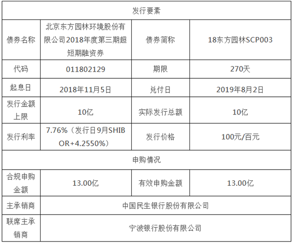 11月5日東方園林發(fā)布了《東方園林超短期融資券發(fā)行情況公告》,具體內(nèi)容如下:北京東方園林環(huán)境股份有限公司超短期融資券發(fā)行情況公告證券代碼:002310股票簡(jiǎn)稱(chēng):東方園林公告編號(hào):2018-163本公司及董事會(huì)全體成員保證信息披露的內(nèi)容真實(shí)、準(zhǔn)確、完整,沒(méi)有虛假記載、誤導(dǎo)性陳述或重大遺漏。北京東方園林...