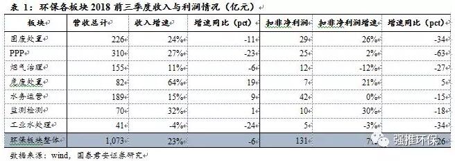 摘要危廢、固廢與監(jiān)測(cè)板塊維持強(qiáng)勁增長(zhǎng)2018前三季度環(huán)保行業(yè)整體①營(yíng)業(yè)收入1073億元,同比增長(zhǎng)23%,增速同比回落6pct,Q3單季收入391億元,同比增15%;②前三季度環(huán)保板塊實(shí)現(xiàn)扣非凈利潤(rùn)131億元,同比增7%,增速同比回落26pct,Q3單季扣非凈利潤(rùn)50億元,同比增1%,增速回落29pc...