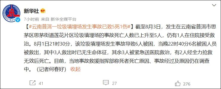 8月1日普洱市思茅區(qū)蓮花片區(qū)垃圾填埋場發(fā)生事故致6人被困目前事故死亡人數(shù)已上升至5人# 事件經(jīng)過 #8月1日21時30分,普洱市思茅區(qū)相關(guān)部門接到報警,思茅街道蓮花片區(qū)垃圾填埋場有人被困。事故發(fā)生后,市委、市政府和思茅區(qū)委、區(qū)政府高度重視,市區(qū)兩級迅速成立“8.01”事故救援指揮部進行現(xiàn)場緊急救援。...