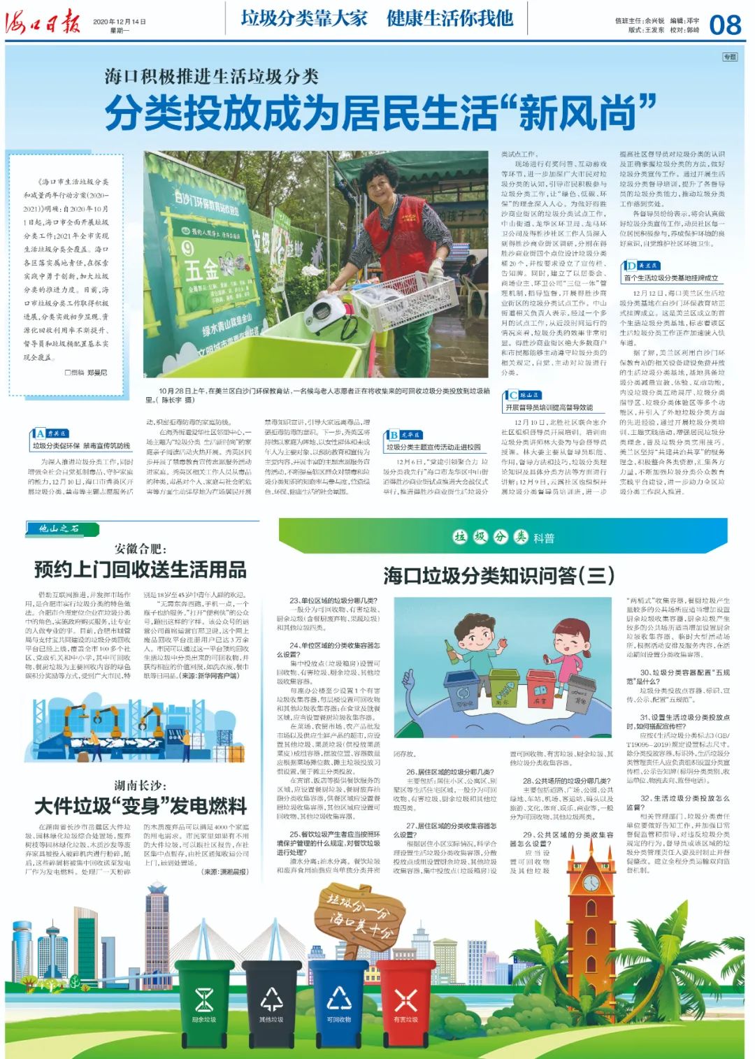 文章導(dǎo)讀《海口市生活垃圾分類和減量?jī)赡晷袆?dòng)方案(2020-2021)》明確:自2020年10月1日起,??谑腥骈_展垃圾分類工作;2021年全市實(shí)現(xiàn)生活垃圾分類全覆蓋。海口各區(qū)落實(shí)屬地責(zé)任,在探索實(shí)踐中勇于創(chuàng)新,加大垃圾分類的推進(jìn)力度。目前,??谑欣诸惞ぷ魅〉梅e極進(jìn)展,分類實(shí)效初步顯現(xiàn)、資源化回...