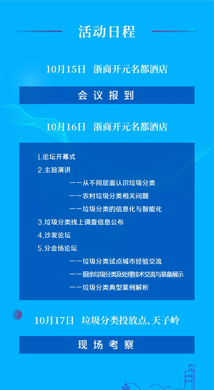 文章導(dǎo)讀中國(guó)城市環(huán)境衛(wèi)生協(xié)會(huì)垃圾分類專業(yè)委員會(huì)舉辦的“2020 垃圾分類杭州高峰論壇”,將于2020 年 10 月 15 日—17 日在杭州舉行。會(huì)議以“找差距、補(bǔ)短板,強(qiáng)化垃圾分類全過(guò)程管理”為主題,將薈萃全國(guó)環(huán)衛(wèi)領(lǐng)域精英,包括中國(guó)城市環(huán)境衛(wèi)生協(xié)會(huì)會(huì)長(zhǎng)徐文龍、中國(guó)城市環(huán)境衛(wèi)生協(xié)會(huì)秘書(shū)長(zhǎng)劉晶昊、中國(guó)...
