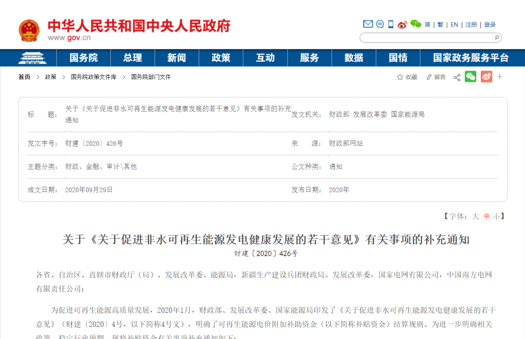 文章導(dǎo)讀為促進(jìn)可再生能源高質(zhì)量發(fā)展,2020年1月,財(cái)政部、發(fā)展改革委、國(guó)家能源局印發(fā)了《關(guān)于促進(jìn)非水可再生能源發(fā)電健康發(fā)展的若干意見(jiàn)》(財(cái)建〔2020〕4號(hào),以下簡(jiǎn)稱4號(hào)文),明確了可再生能源電價(jià)附加補(bǔ)助資金(以下簡(jiǎn)稱補(bǔ)貼資金)結(jié)算規(guī)則。為進(jìn)一步明確相關(guān)政策,穩(wěn)定行業(yè)預(yù)期,現(xiàn)將補(bǔ)貼資金有關(guān)事項(xiàng)補(bǔ)充...