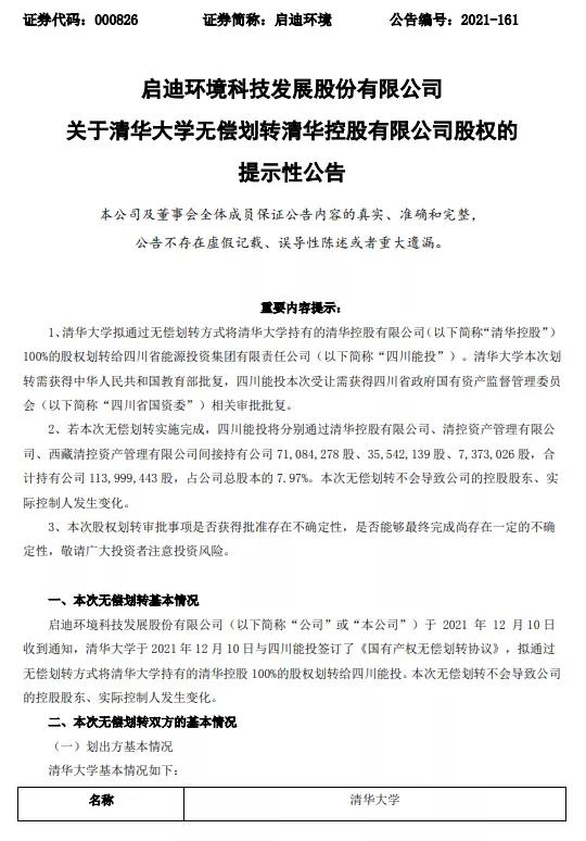 城發(fā)環(huán)境吸并啟迪環(huán)境一事,又有新消息。 不過,這一次不是兩家公司自己的動(dòng)作,而是啟迪環(huán)境的母公司有了新變動(dòng)。 12月11日,啟迪環(huán)境發(fā)布公告稱,四川省能源投資集團(tuán)有限責(zé)任公司(下稱“四川能投”)與清華大學(xué)于12月10日簽署《國有產(chǎn)權(quán)無償劃轉(zhuǎn)協(xié)議》,以無償劃轉(zhuǎn)方式接收清華大學(xué)持有的清華控股100%股權(quán)...