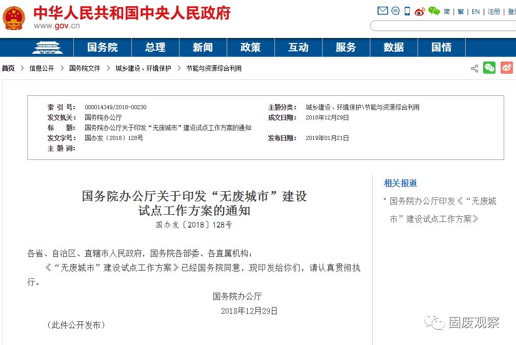 “無廢城市”是建設美麗中國的細胞工程,黨中央、國務院高度重視“無廢城市”建設。2018年12月,中央全面深化改革委員會審議通過了《“無廢城市”建設試點工作方案》(以下簡稱《方案》),近日由國辦印發(fā)。這是黨中央、國務院在打好污染防治攻堅戰(zhàn)、決勝全面建成小康社會關鍵階段作出的重大改革部署,是深入落實習近...