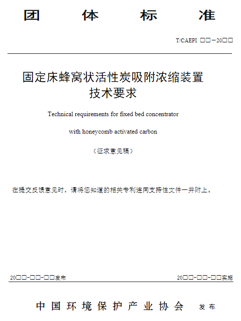 各有關(guān)單位: 為促進(jìn)固定床蜂窩狀活性炭吸附技術(shù)發(fā)展,規(guī)范固定床蜂窩狀活性炭吸附濃縮裝置的制造使用,我會(huì)下達(dá)編制中國(guó)環(huán)境保護(hù)產(chǎn)業(yè)協(xié)會(huì)標(biāo)準(zhǔn)《固定床蜂窩狀活性炭吸附濃縮裝置技術(shù)要求》。目前,標(biāo)準(zhǔn)編制單位已完成標(biāo)準(zhǔn)的征求意見稿。根據(jù)《中國(guó)環(huán)境保護(hù)產(chǎn)業(yè)協(xié)會(huì)標(biāo)準(zhǔn)管理辦法》的規(guī)定,現(xiàn)將該標(biāo)準(zhǔn)征求意見稿和有關(guān)材料印...
