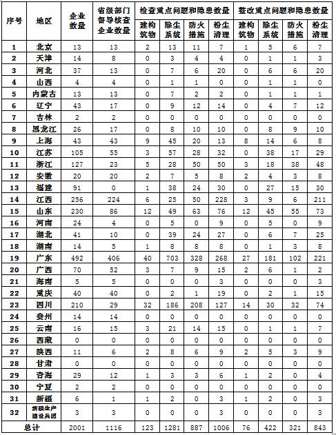 國家安監(jiān)總局辦公廳近日發(fā)布《關(guān)于2017年工貿(mào)行業(yè)專項(xiàng)整治工作進(jìn)展情況的通報(bào)》?!锻▓?bào)》指出,2017年,全國工貿(mào)行業(yè)企業(yè)沒有發(fā)生較大及以上事故。對(duì)存在各類隱患的粉塵涉爆企業(yè),限期整改18087家、停產(chǎn)整頓3380家、取締關(guān)閉3601家、執(zhí)法處罰3504萬元。《通報(bào)》指出,截至2017年底,各地區(qū)共...