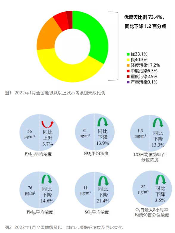 生態(tài)環(huán)境部今日向媒體通報(bào)了2022年1月全國環(huán)境空氣質(zhì)量狀況。 總體情況 1月,全國339個地級及以上城市平均空氣質(zhì)量優(yōu)良天數(shù)比例為73.4%,同比下降1.2個百分點(diǎn);PM2.5平均濃度為56微克/立方米,同比上升3.7%;PM10平均濃度為76微克/立方米,同比下降14.6%;O3平均濃度為82微...
