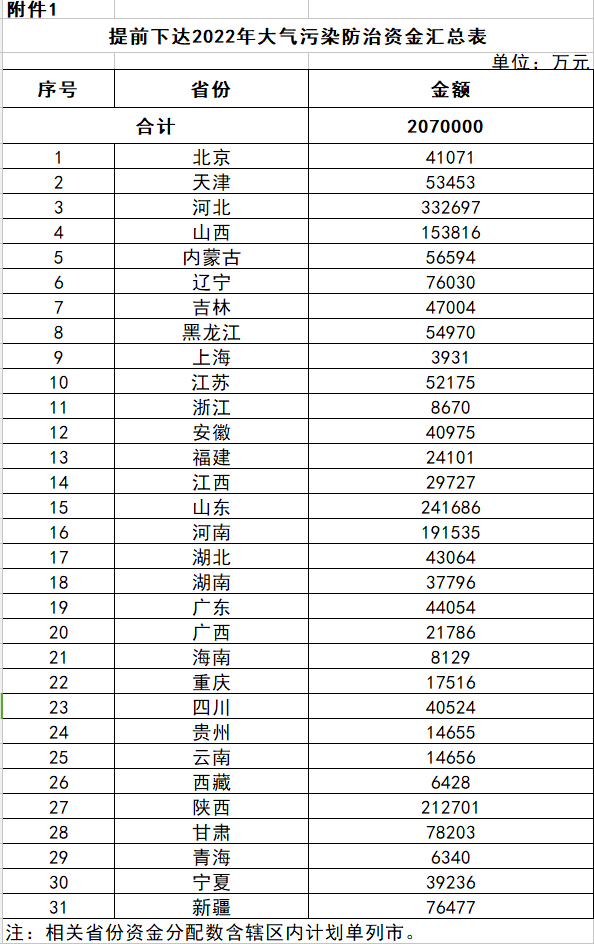 財(cái)政部關(guān)于提前下達(dá)2022年大氣污染防治資金預(yù)算的通知 財(cái)資環(huán)〔2021〕114號(hào) 各省、自治區(qū)、直轄市財(cái)政廳(局): 為支持大氣污染防治工作,促進(jìn)大氣質(zhì)量改善,現(xiàn)下達(dá)你省(自治區(qū)、直轄市,以下簡稱省)2022年大氣污染防治資金,用于支持開展減污降碳等方面相關(guān)工作,并就有關(guān)事項(xiàng)通知如下: 一、各省安...