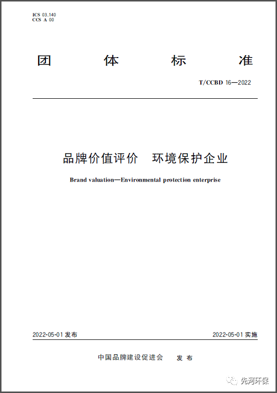 《品牌價(jià)值評(píng)價(jià) 環(huán)境保護(hù)企業(yè)》團(tuán)體標(biāo)準(zhǔn) T/CCBD16-2022正式發(fā)布實(shí)施! 2022年5月1日,在中國(guó)品牌建設(shè)促進(jìn)會(huì)的指導(dǎo)下,由河北先河環(huán)??萍脊煞萦邢薰镜?5家企業(yè)共同參與并制定的《品牌價(jià)值評(píng)價(jià) 環(huán)境保護(hù)企業(yè)》團(tuán)體標(biāo)準(zhǔn)T/CCBD 16-2022于2022年5月1日正式發(fā)布實(shí)施。 該標(biāo)準(zhǔn)基...