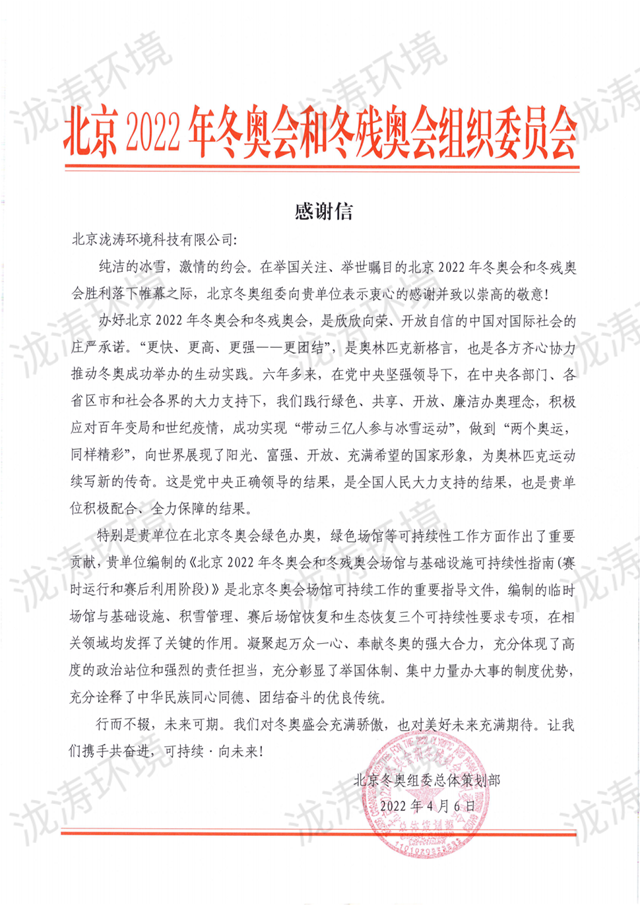 北京2022年冬奧會和冬殘奧會圓滿落幕,純潔的冰雪、激情的約會再次生動(dòng)詮釋了奧林匹克運(yùn)動(dòng)精神,也為“綠色辦奧”理念提供了國際范本。北京瀧濤環(huán)境科技有限公司作為生態(tài)環(huán)境綜合服務(wù)供應(yīng)商,很榮幸有機(jī)會深度參與2022年冬季奧運(yùn)會,賦能綠色奧運(yùn),收獲了來自北京冬奧組委總體策劃部的感謝...