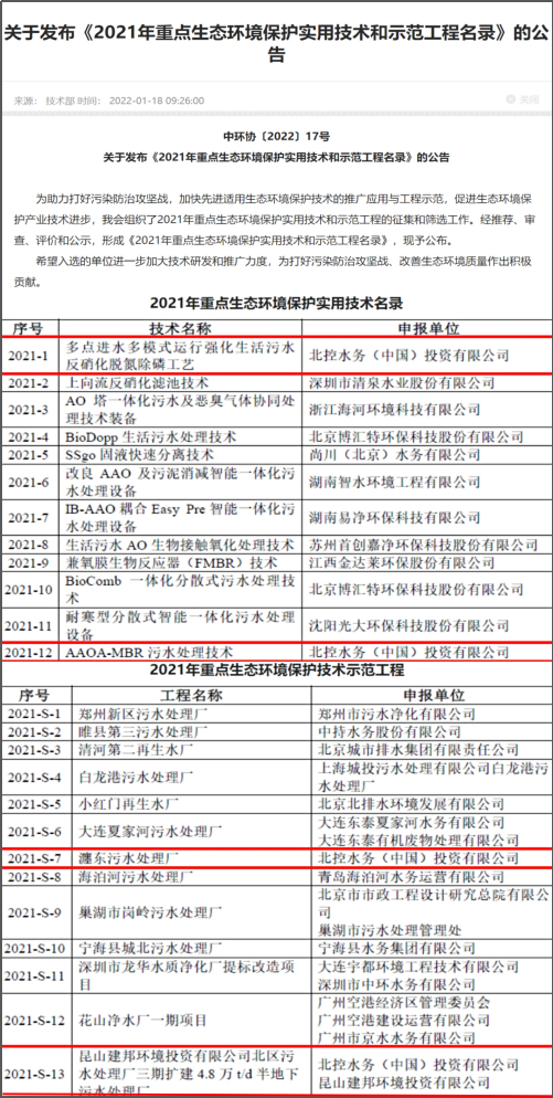近日,中國環(huán)境保護產(chǎn)業(yè)協(xié)會公布了《2021年重點生態(tài)環(huán)境保護實用技術和示范工程名錄》, 北控水務申報的兩項技術、兩項工程成功上榜,分別入選“實用技術名錄”及“示范工程名錄”,彰顯了北控水務專業(yè)的技術能力和運營實力。 兩項實用技術上榜 技術專業(yè)創(chuàng)新能力獲...