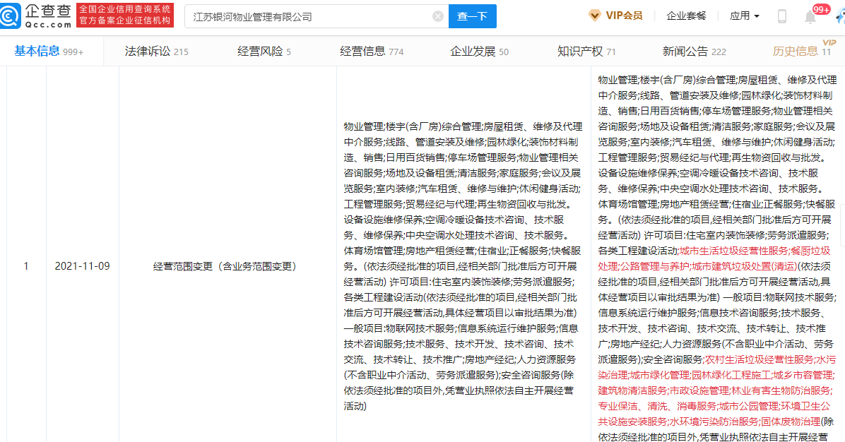 近日,中國固廢網(wǎng)從企查查獲悉,11月9日,江蘇銀河物業(yè)管理有限公司(簡稱“蘇寧銀河物業(yè)”)經(jīng)營范圍發(fā)生變更,增加了:城市生活垃圾經(jīng)營性服務(wù);餐廚垃圾處理;公路管理與養(yǎng)護(hù);城市建筑垃圾處置(清運(yùn));農(nóng)村生活垃圾經(jīng)營性服務(wù);水污染治理;城市綠化管理;園林綠化工程施工;城鄉(xiāng)市容管理...