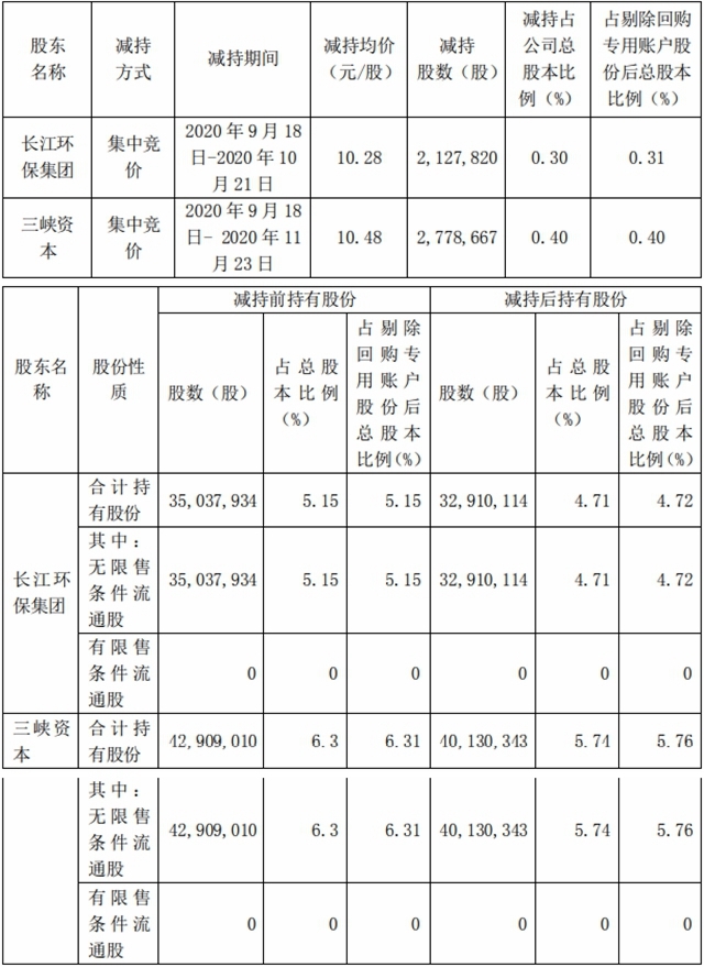 2021年3月19日,中節(jié)能國(guó)禎環(huán)保科技股份有限公司發(fā)布《關(guān)于持股 5%以上股東股份減持計(jì)劃期滿暨實(shí)施結(jié)果的公告》。 即長(zhǎng)江生態(tài)環(huán)保集團(tuán)有限公司與其一致行動(dòng)人三峽資本控股有限責(zé)任公司計(jì)劃在6個(gè)月內(nèi)以集中競(jìng)價(jià)交易、大宗交易或換購(gòu)交易型開放式指數(shù)證券投資基金(ETF)方式減持不超過(guò)33,975,437股...