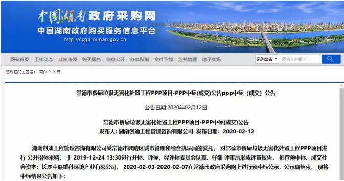 常德市餐廚垃圾無害化處置工程PPP項目近日發(fā)布中標結果公示。中標供應商為:長沙中聯(lián)重科環(huán)境產(chǎn)業(yè)有限公司(以下簡稱中聯(lián)環(huán)境)。合作期限為30年。 該項目于 2019-12-24 13:30進行開標、評標,經(jīng)評標委員會認真、仔細 評審后形成評審報告,推薦預中標、成交社會資本:長沙中聯(lián)重科環(huán)境產(chǎn)業(yè)有限公司...